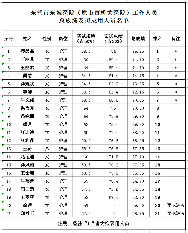 根據(jù)本次招聘活動的安排,現(xiàn)將東營市東城醫(yī)院(原市直機關(guān)醫(yī)院)招聘工作人員的總成績及擬錄用人員名單予以公布。望擬錄用人員按照統(tǒng)一規(guī)定和要求辦理相關(guān)手續(xù)。