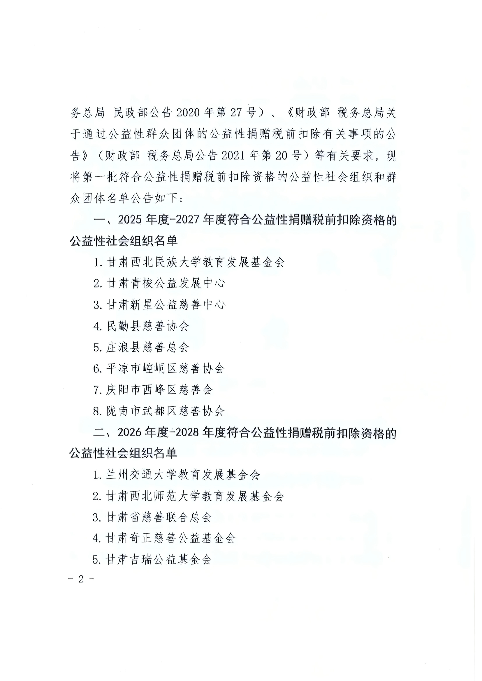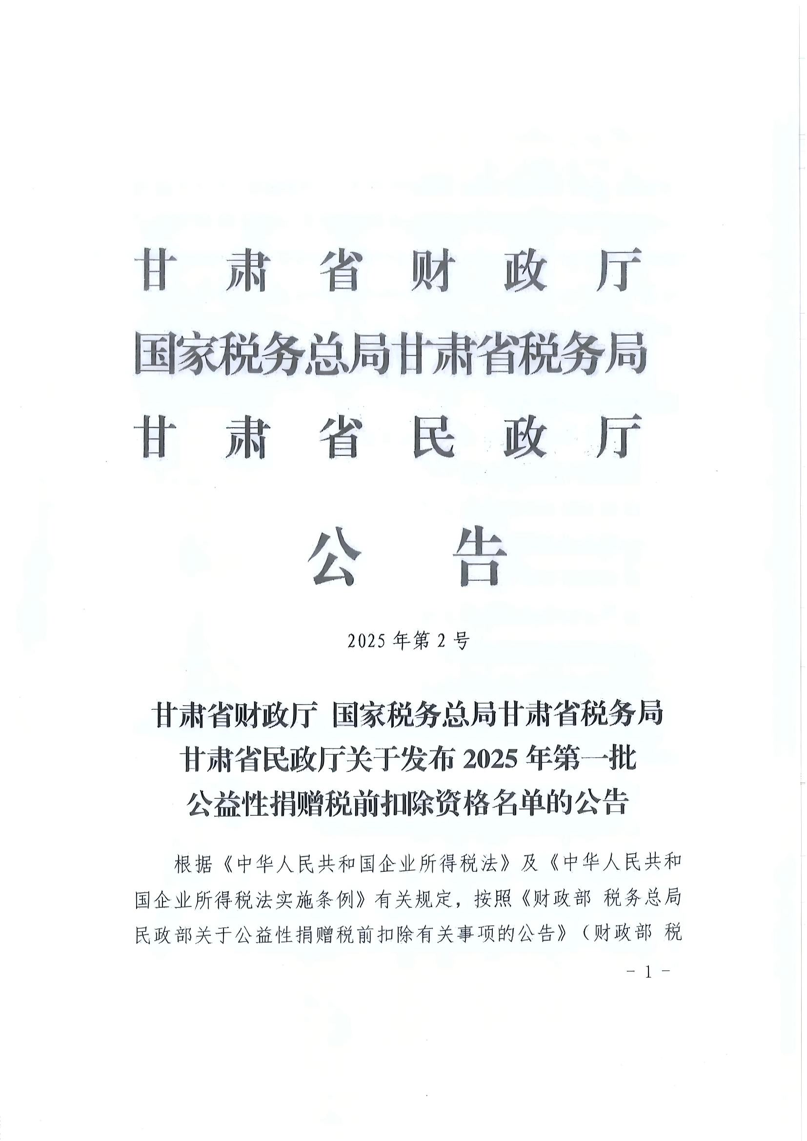 公告| 甘肅省財(cái)政廳國(guó)家稅務(wù)總局甘肅省稅務(wù)局甘肅省民政廳關(guān)于發(fā)布 2025年第一批公益性捐贈(zèng)稅前扣除資格名單的公告